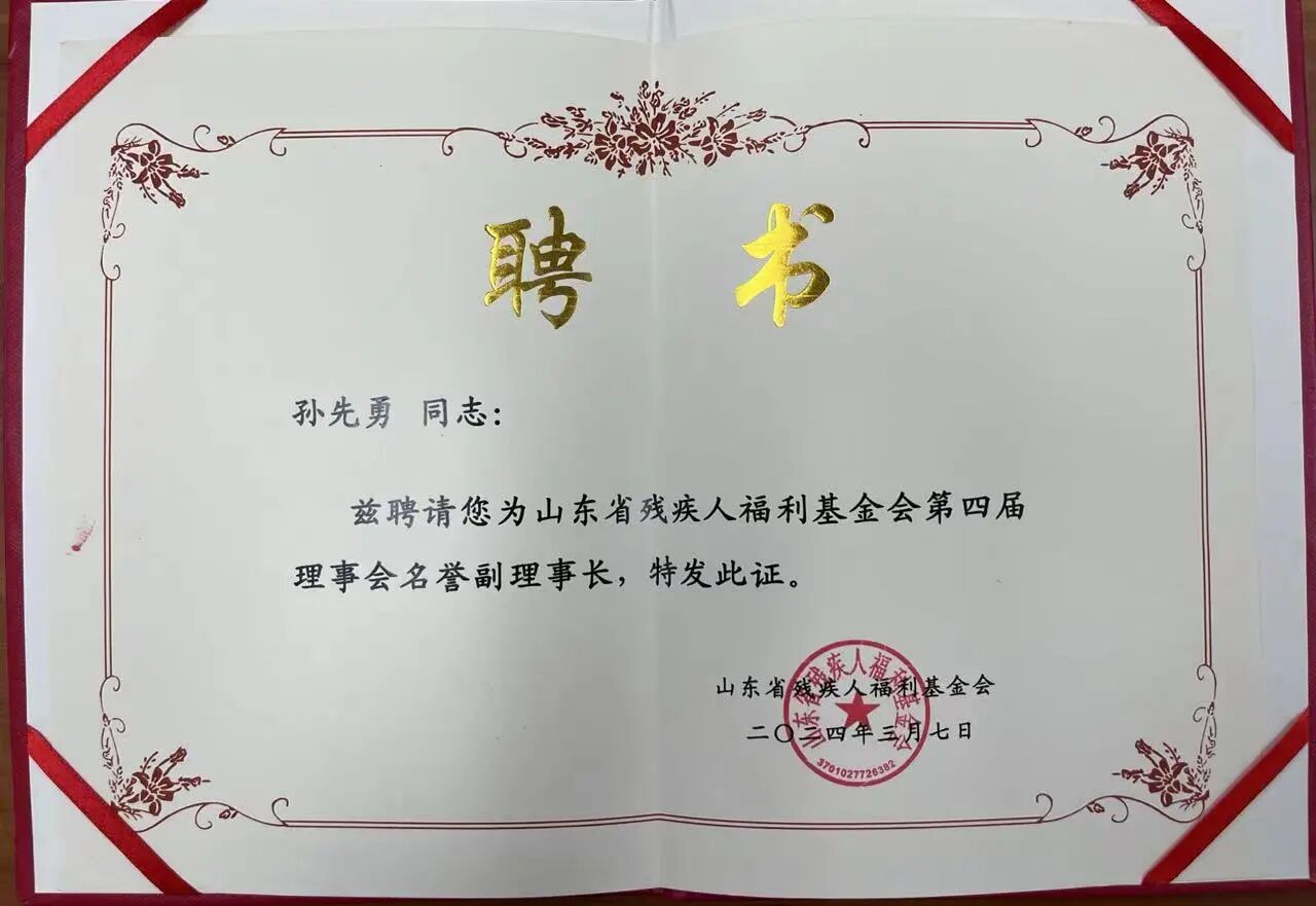 鉴于正大光明眼科集团在残疾人慈善事业中作出的突出贡献,根据《山东省残疾人福利基金会捐赠鸣谢制度》相关规定,省基金会决定授予正大光明眼科集团总院长孙先勇同志“山东省残疾人福利基金会名誉副理事长”称号,由杨忠民理事长为其颁发聘书。