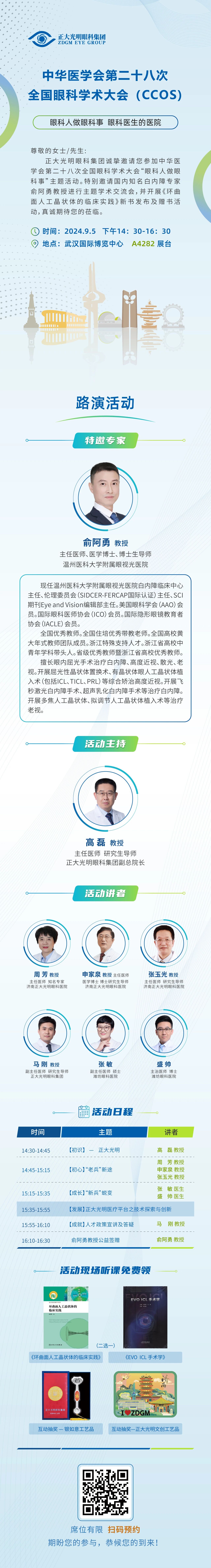 在学术盛宴之外,正大光明眼科集团展台(A4282号)将惊艳亮相全国眼科年会,并于9月5日下午呈现“眼科人做眼科事”专场路演活动。活动特别邀请国内知名白内障专家俞阿勇教授进行主题学术交流会,并开展《环曲面人工晶状体的临床实践》新书发布及赠书活动,为与会者带来眼科学前沿的深刻洞察与启迪。现场更有接连不断的惊喜等着您,莅临活动现场的各位老师都将有机会参与赠书活动及互动抽奖,亮点纷呈,奖品优厚,期待您的参与~