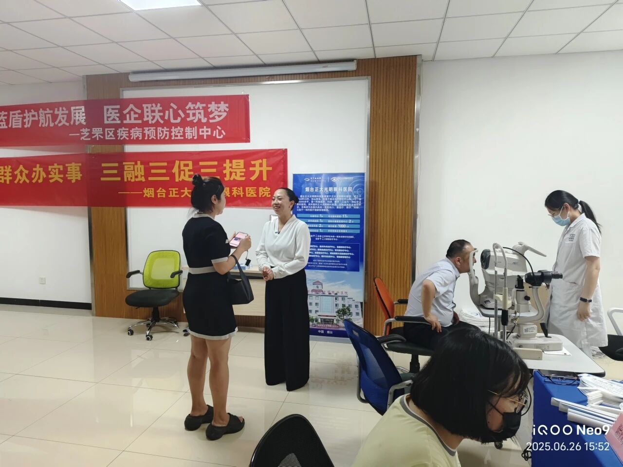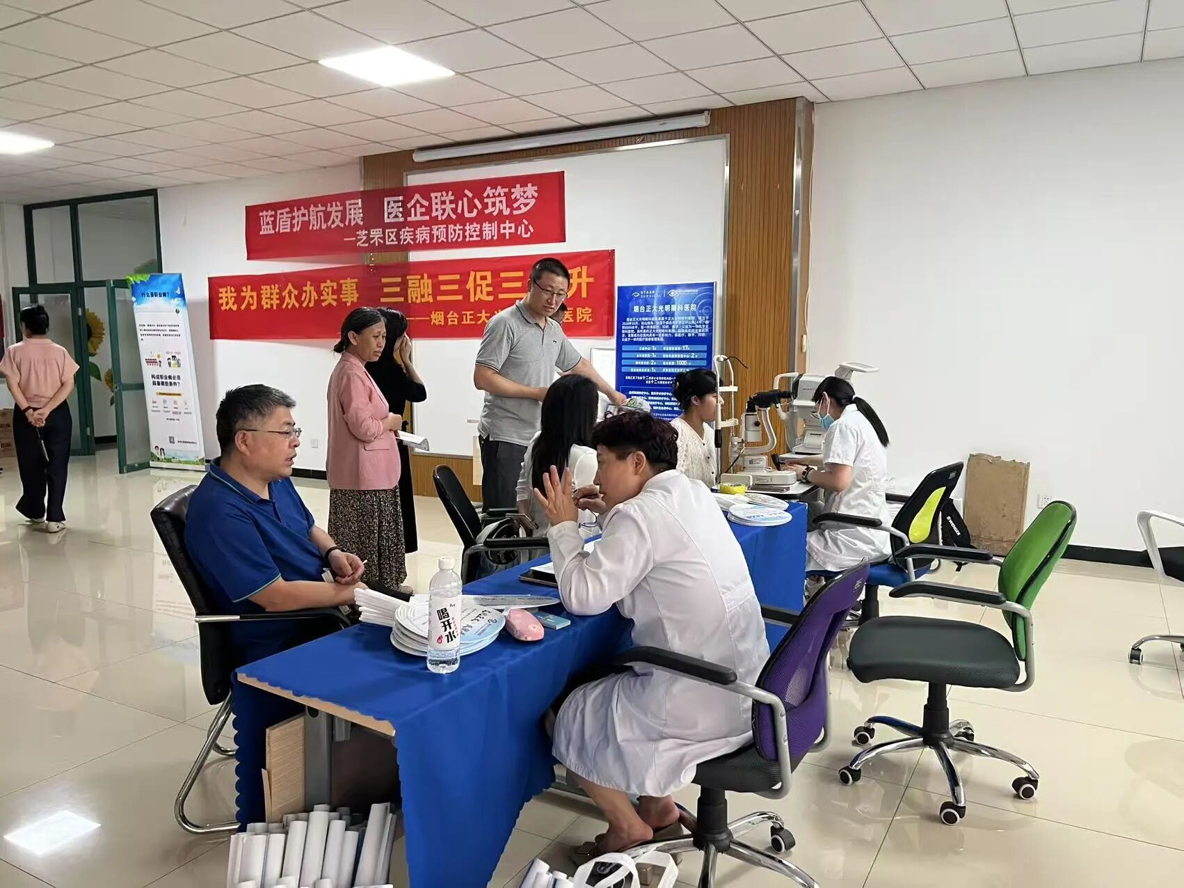 作为本次联合党建活动的核心内容之一,“健康四季”夏季专项行动在分会场东方电子集团有限公司同步火热展开。烟台正大光明眼科医院的专业医疗团队带着设备与热忱,为现场的企业职工代表提供了专业的眼健康筛查和一对一的眼健康咨询服务。