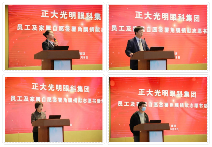 潍坊市红十字会张剑敏主任、正大光明眼科集团总院长孙先勇教授及受捐者家属代表讲话,工会主席邱璐主持。