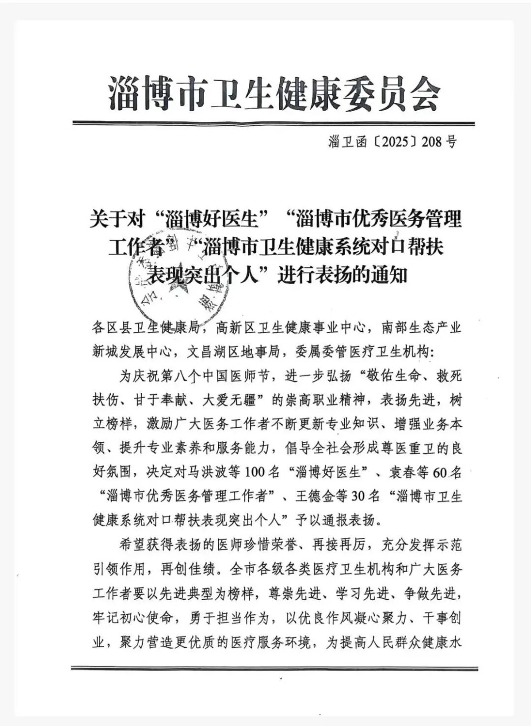 近日,淄博市卫生健康委员会发布《关于表扬全市卫生健康系统“淄博好医生”“淄博市优秀医务管理工作者”“淄博市卫生健康系统对口帮扶表现突出个人”的通知》(淄卫函〔2025〕208号),对在全市卫生健康事业中表现突出的个人和集体予以通报表扬,我院吴鹏院长荣列榜单,获得殊荣,被评为淄博好医生。